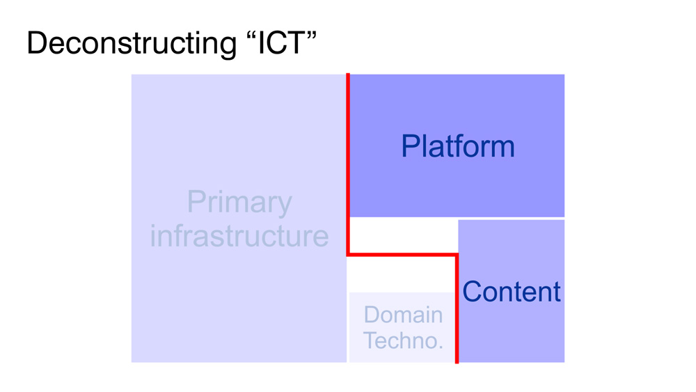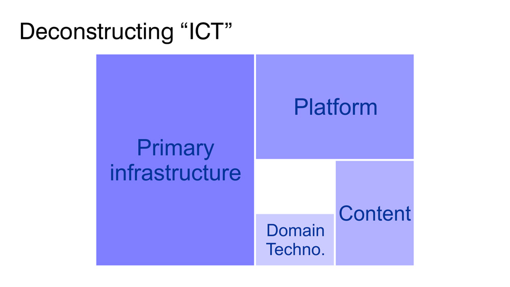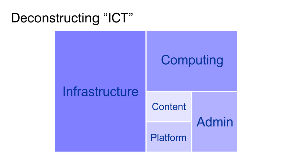 We also use “ICT” to refer to the infrastructure – the computers, the peripherals, the network – all the stuff that we buy in order to deliver various applications.