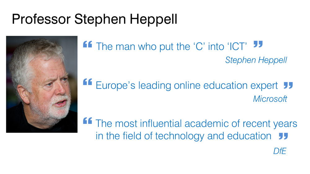Its against that background that I want to talk about Professor Stephen Heppell, who has been an influential figure in the world of ICT. You could almost say that he has been its architect. He claims for himself the epithet of “the man who put the C into ICT”, having been an author of the influential 1997 Stevenson Report. He was called “Europe’s leading online education expert” by Microsoft; and “The most influential academic of recent years in the field of technology and education” by the DfE. He is giving one of the leading keynotes at the BETT Show next February.