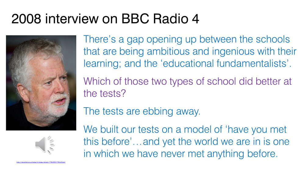 It is also not true that our tests have necessarily been based on a model of ‘have you met this before’ – but that is a point I will come to in a second.[Comment by Stephen Heppell, who disagrees that this slide represents his position fairly]