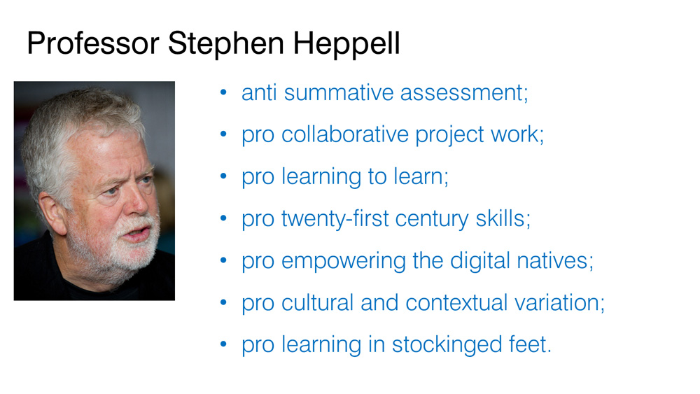 The first thing to notice is that Professor Heppell doesn’t answer the question (the mark of a politician, you might say, not an academic). But because he ducks the question, we can be fairly sure that the schools that follow the Heppell way do not do better in the tests. So if in your school you are interested in doing better in the tests, then perhaps you should bear that in mind before you listen to what Professor Heppell says.
