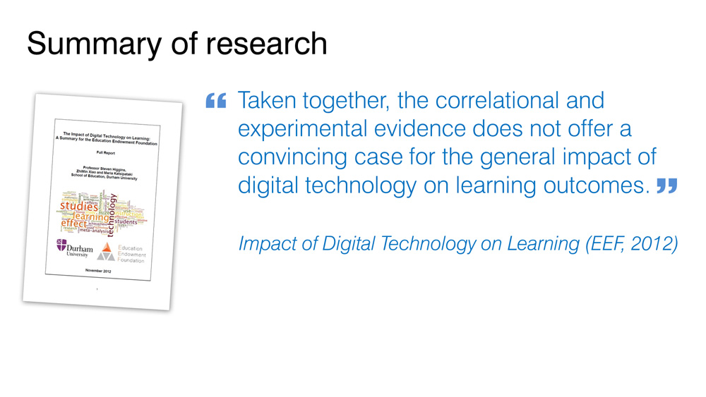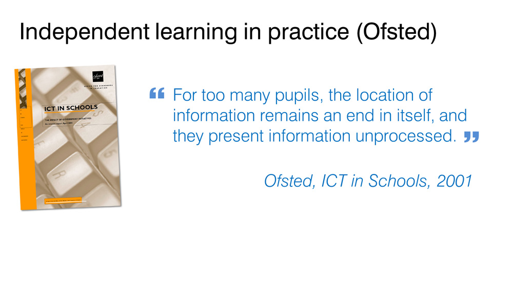 And Professor Laurillard’s conclusion is confirmed by one of the early Ofsted reports on ICT in education (see slide above). “Internet research”, which sounds so advanced and grown up, so compatible with theories of independent learning, is too often in practice an easy homework that requires no preparation, no marking, little work and even less thought.