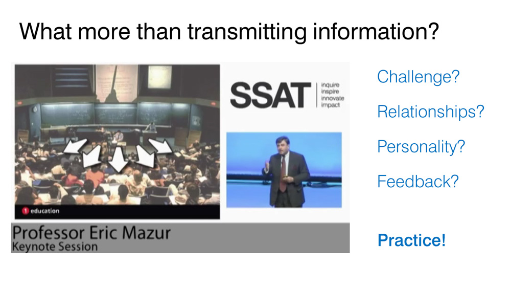 But as Professor Mazur explains, practice is an essential part of effective teaching. And once the learner is practicing, why would I, as the teacher, not want to track what is going on, so that I can offer criticism and support, so that I can suggest what the student should do next? And once my student is practicing something, and I monitoring that practice, how am I not assessing them? Assessment is not, as most teachers think, a distraction from teaching. It is its very essence. Which of course does not excuse the damaging effect on education of badly conceived tests.
