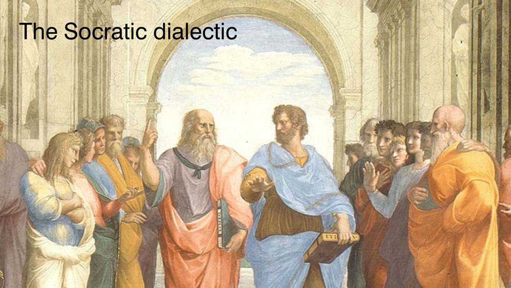 …the Socratic dialectic. Socrates used to sit down in the market square with his pupils and engage them with questions.