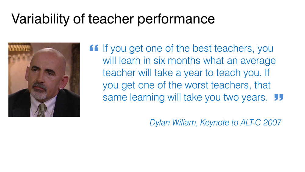 Don’t you find it surprising that a hall full of teachers cannot answer what must be one of the simplest and most important questions about their own professional practice? “Challenge” and “feedback” are warm, I suppose, but neither gives an accurate answer to the question. And I find “personality” and “relationships” very revealing—because that is how I think most teachers understand their job (see my recent Why teachers don’t know best for the full argument). As long as they can motivate, as long as they can inspire, as long as they can get the children to like them, the process of teaching isn’t really so important. Teachers see teaching very much as a personal craft, and not, as Diana Laurillard calls it in her book, a “design science” like engineering.