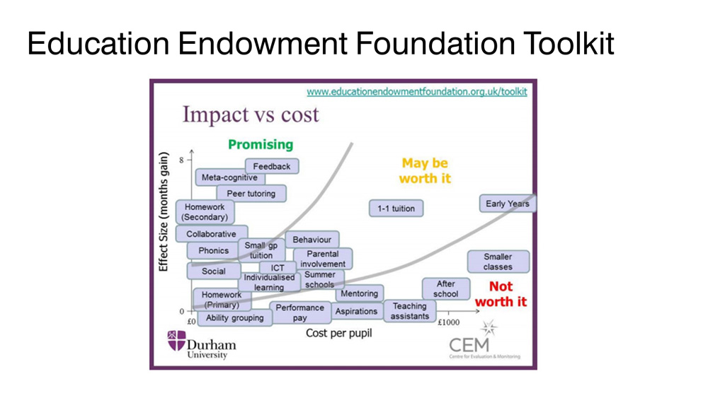 If all those three variables are independent (which they are probably not) you would be able to say that the proportion of research that was about teaching and learning and that used robust quantitative evidence and that was free from methodological flaws, was about 0.5%. We can’t say that with certainty – but we can say that the proportion of educational research that is useful to our purpose is diminishingly small.
