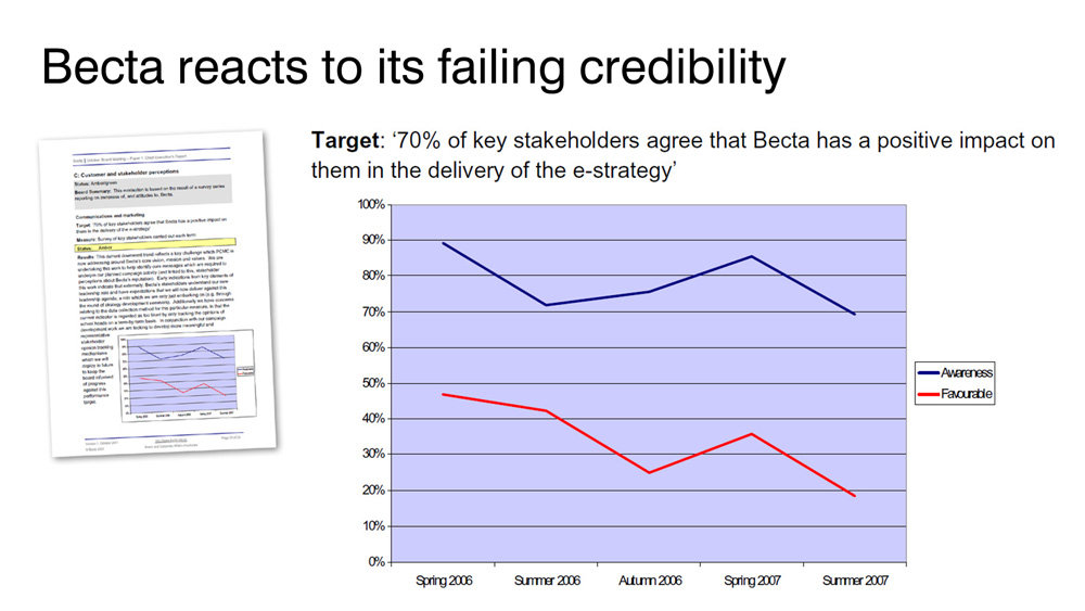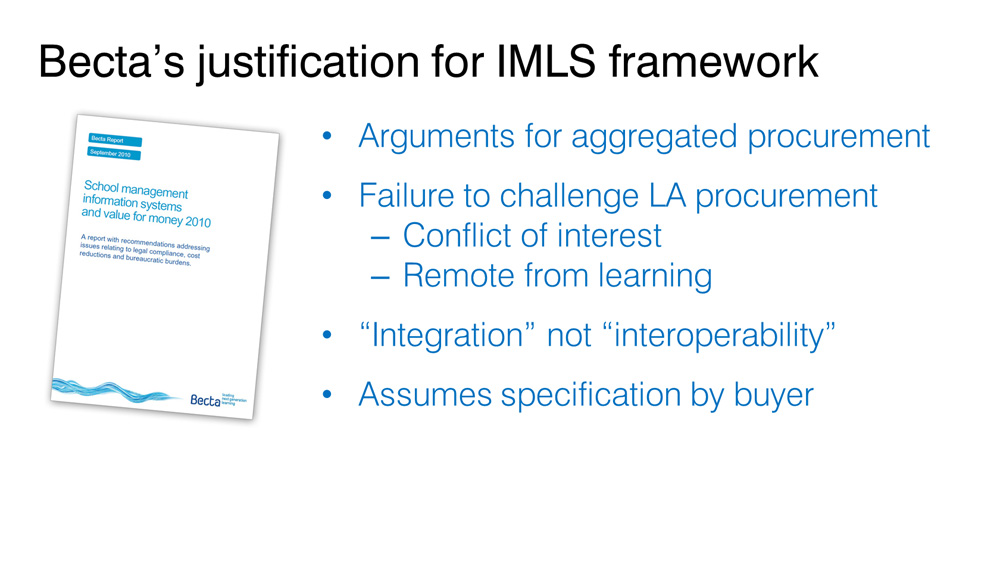 This is the transcript of a presentation I gave at the EdExec conference, held by ICT Matters in London on 6 November 2013. The ostensible argument in my talk is that “procurement matters”, which I will admit, probably isn’t going to set your heart racing. But perhaps it should. The reason why procurement matters is that technology matters – and this is a point that much of the ICT community do not generally admit. Time and again, you hear the old saw being repeated, “never mind the technology, where’s the learning?” Most of my talk addressed addressed this point—and in doing so, I take on (as is my wont in this blog) a lot of shibboleths. I summarise some arguments with which those of you who have read previous posts may be familiar, and I also shadow some arguments that I will develop in greater detail in future. And I return to a promise that I made in my first post to this blog in January 2012, which is to discuss in rather more depth than I have done before why Becta’s approach to procurement was so lamentable.