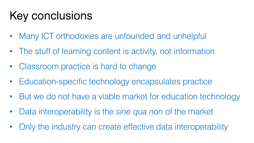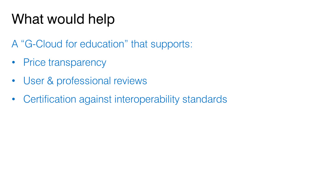 That is what the Department for Education should almost certainly do. Judging on previous form, they almost certainly won’t. But even if we wake up tomorrow, next week, next year and still find that there is no G-Cloud, or any other kind of useful market infrastructure, I hope you will still take away from my talk two things. First, the fact that, contrary to everything you will be told by almost everyone who claims to know anything about ICT, the technology really matters. And second, that the only way we are going to get the right sort of technology, the education-specific technology that is going to make the difference, is if you, the buyers, ask for it.