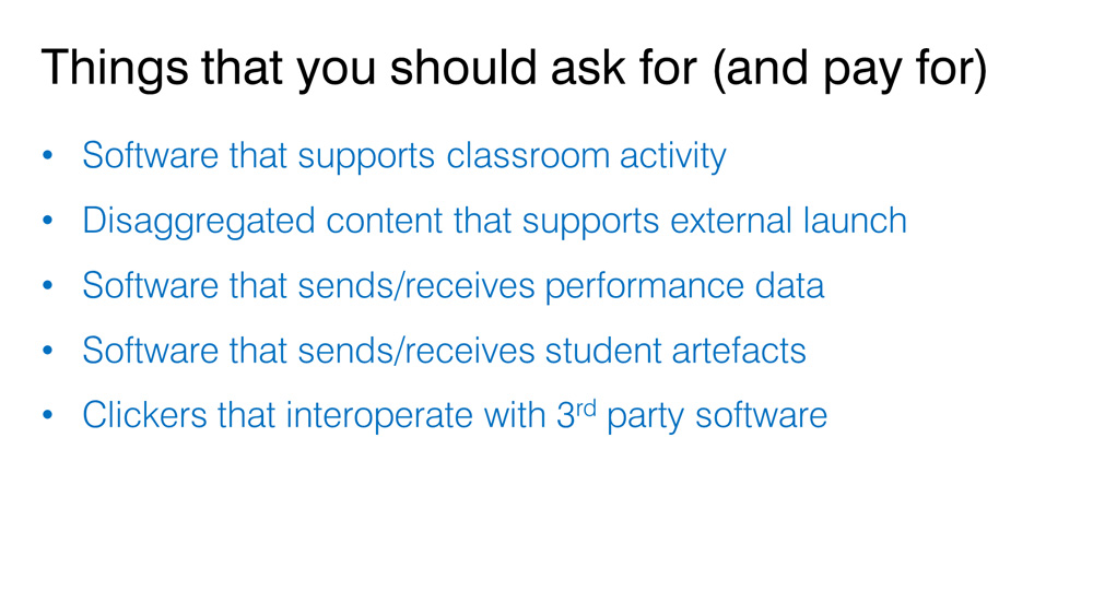 You should ask for classroom response systems that automatically interface to any third-party software. How can anyone develop software to help you implement Professor Mazur’s peer mentoring techniques, when all your clickers that you bought from company x only interface to software provided by company x?