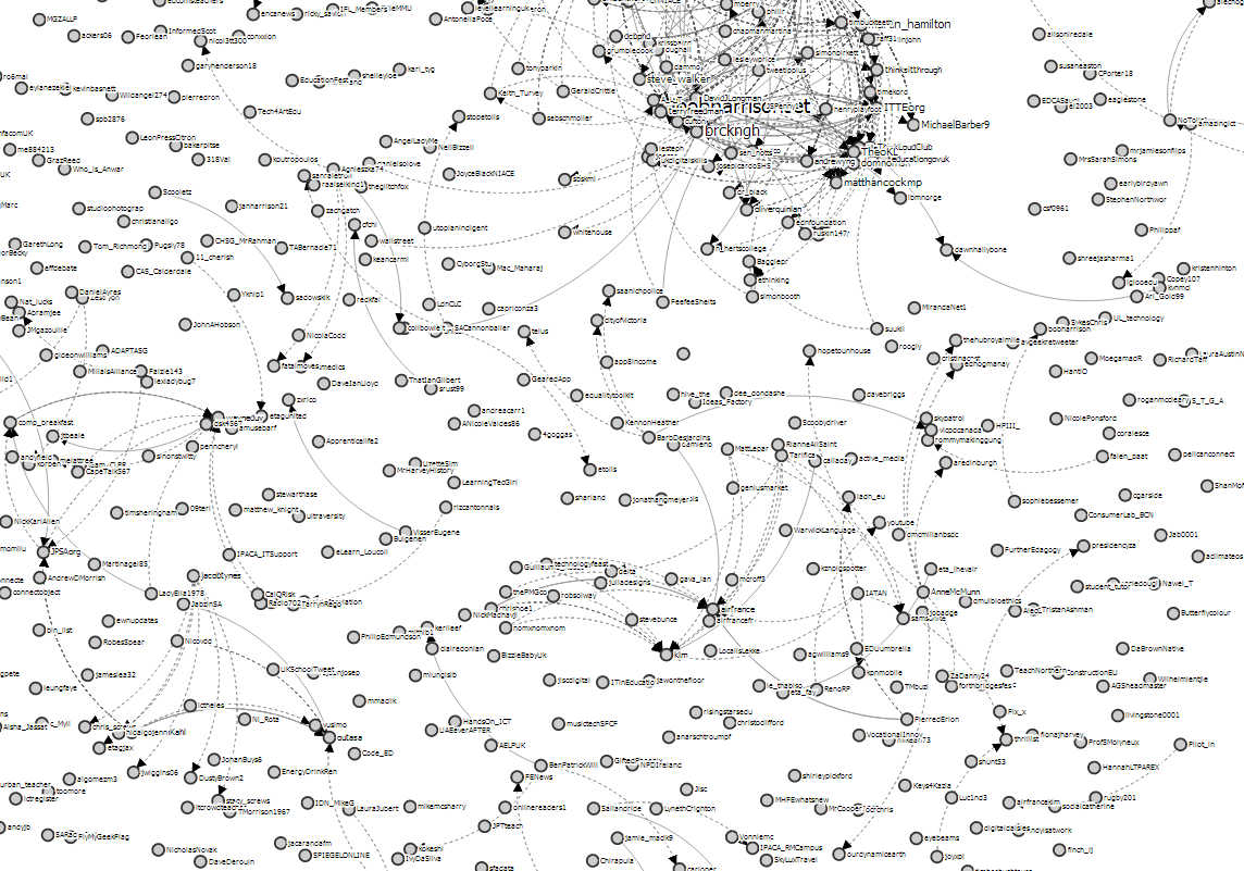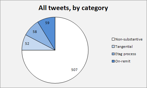 With some technical help from Martin Hawksey (@mhawkesy), who has developed the pretty TAGSExplorer tool (screenshot above), I downloaded all #etag tweets from the opening of the consultation on 23 April through to the end of May. There were a total of 676 (excluding tweets about electronic luggage tagging systems in Africa, gospel churches in America, and the Edinburgh Tourist Advisory Group).
