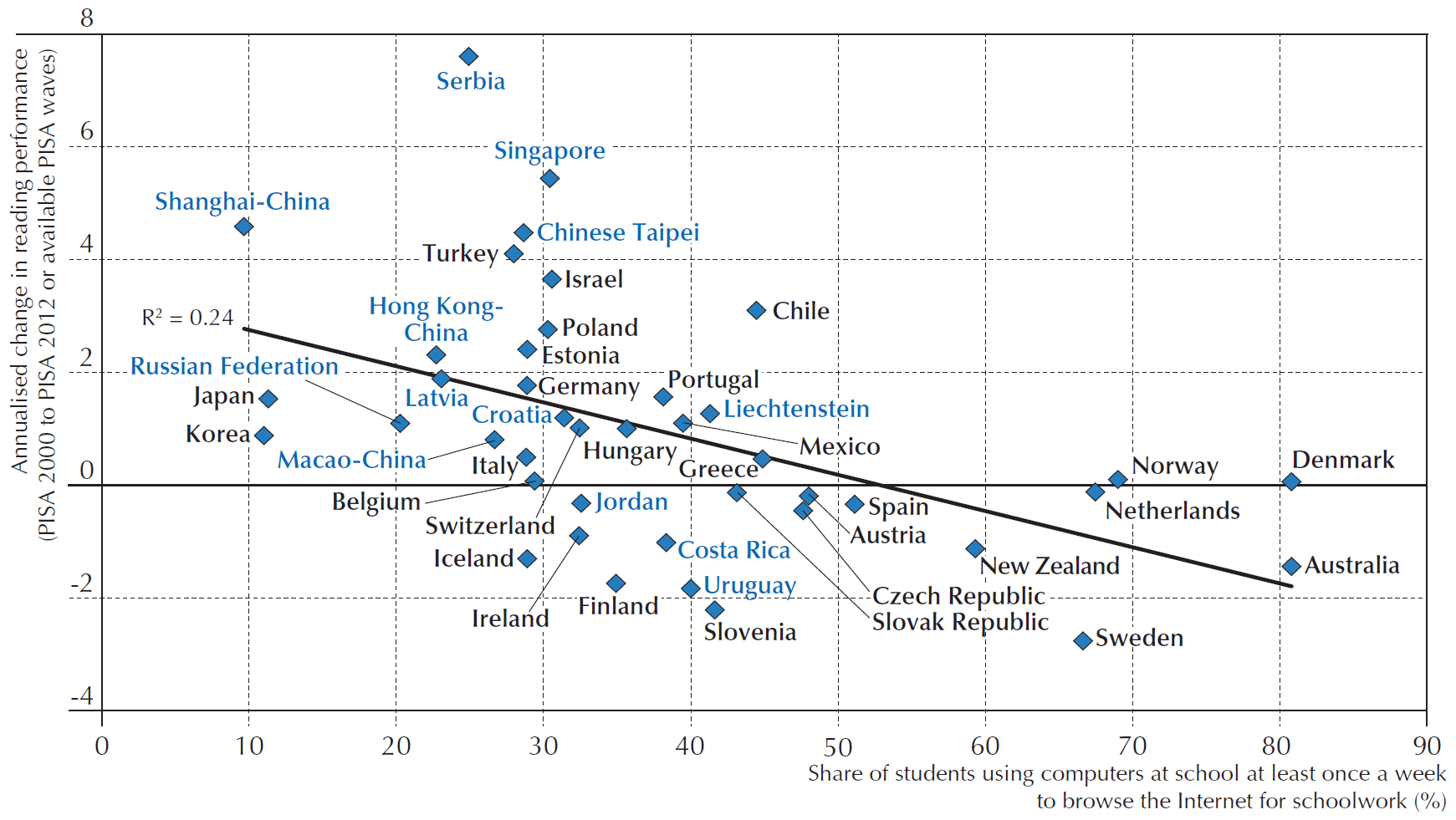 The generally anti-tech conclusion was re-enforced by correlating the amount of improvement between 2003 and 2012 made by different countries in their average PISA scores against computer use in school, as reported in the survey. The mapping produces a broad scatter of results—but with a clear trend-line suggesting an inverse relationship.