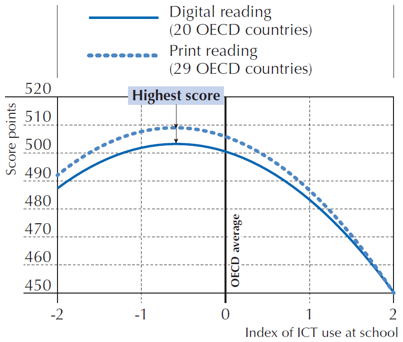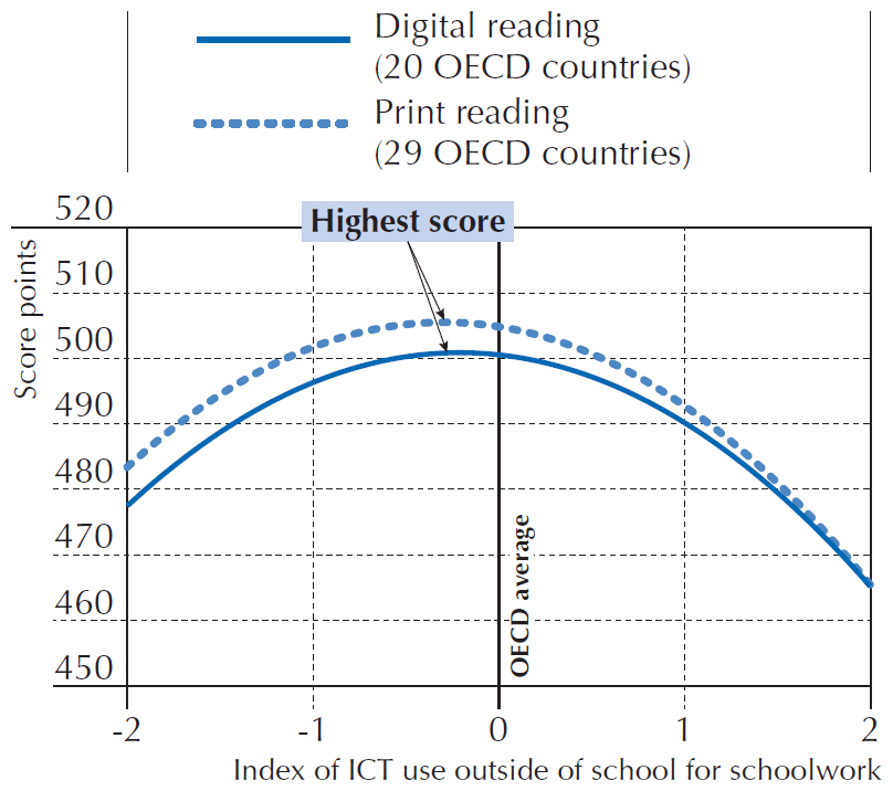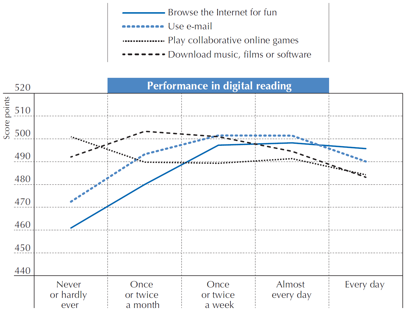 The second graph looks shows the same performance in digital reading compared to the frequency of the use of computers for leisure activities. This shows only a slight drop in performance when computers were used in this way “every day”. The counter-intuitive conclusion from a comparison between the two graphs might be that students do better if they use computers for leisure than for learning. But one should bear in mind that these graphs do not show the total amount of time used for leisure and schoolwork. They hint, rather, at the proportion of schoolwork and leisure time respectively that is spent on computers. My guess is that very frequent computer use for schoolwork might suggest an opportunity cost, replacing more valuable forms of instruction by: