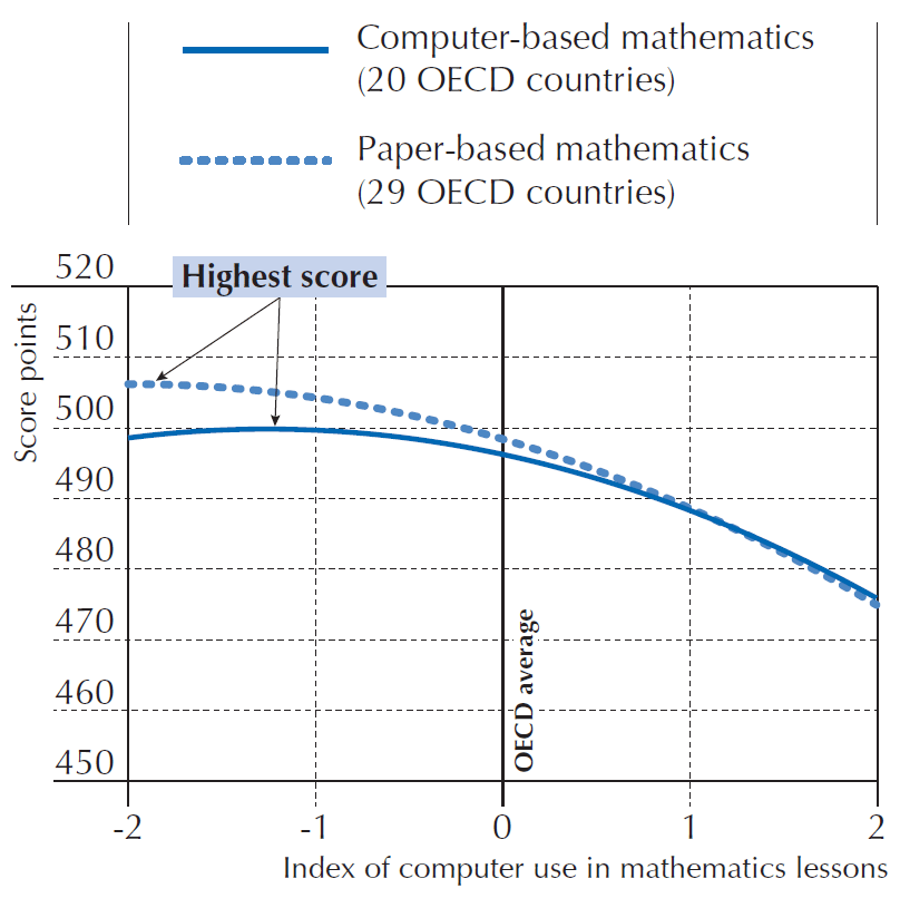 The report found that top performance in the PISA tests was achieved by countries that reported less than average computer use. In the case of maths, the best performances on paper-based mathematics were achieved by students who made the very lowest use of computers in school, so the relationship between technology and achievement was always negative, though the report notes that this inverse relationship was reversed in Belgium, Denmark and Norway, where there was a positive correlation between the use of technology and performance in Maths.